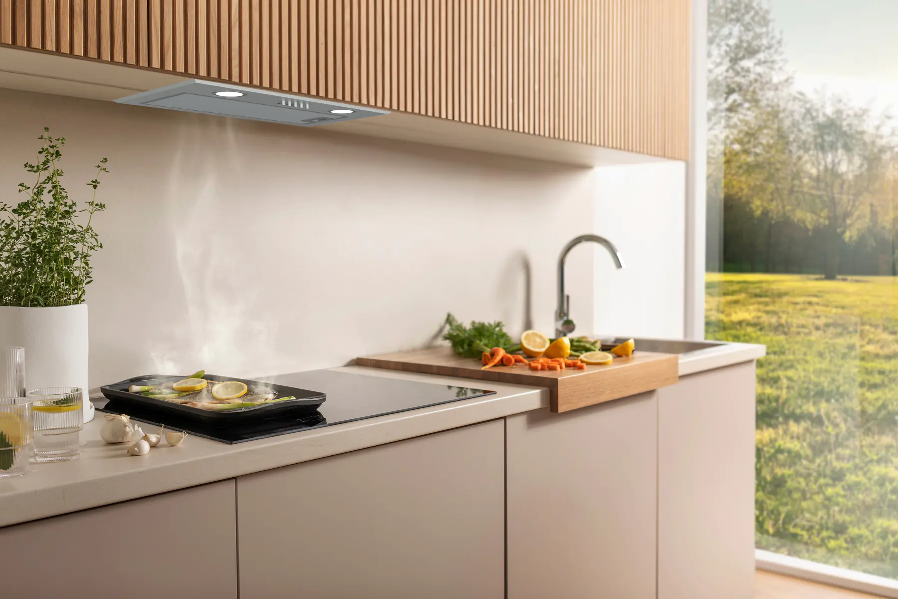 Хорошая вытяжка не делает кухню полностью стерильной, но заметно улучшает комфорт. В помещении становится легче дышать, запахи меньше распространяются по квартире, а поверхности медленнее покрываются липким налётом.